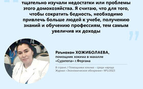 — В настоящее время борьба с бедностью является одним из приоритетных направлений социальной политики нашей страны. Какие основные причины бедности были выявлены среди населения махалли и что сделано для их устранения?