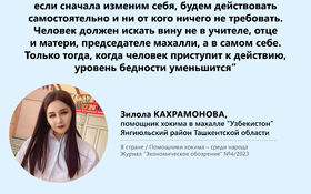 — Конечно, в нашей деятельности очень важно избегать коррупции. Потому что коррупция затмевает наши добрые дела. Большинство направлений работы помощников хокима осуществляются через прозрачную электронную систему. Например, субсидии, выделение кредита, вопросы социальной помощи и т.д. Мы также стараемся строить свою деятельность на принципах прозрачности и открытости. Кроме того, о проведенных работах и их результатах отчитываемся перед жителями махалли, депутатами, вышестоящими организациями, должностными лицами. Все это служит предотвращению коррупции.