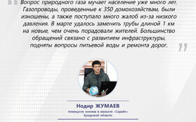 — Эта система, введенная по инициативе нашего уважаемого Президента, служит, в первую очередь, интересам простых людей. Потому что в этой системе проблемы, возникающие в регионах, решаются оперативно на низовом уровне — на месте. Результат в конечном итоге послужит развитию и будущему Родины, а экономическое и социальное развитие нашей страны ускорится.