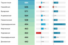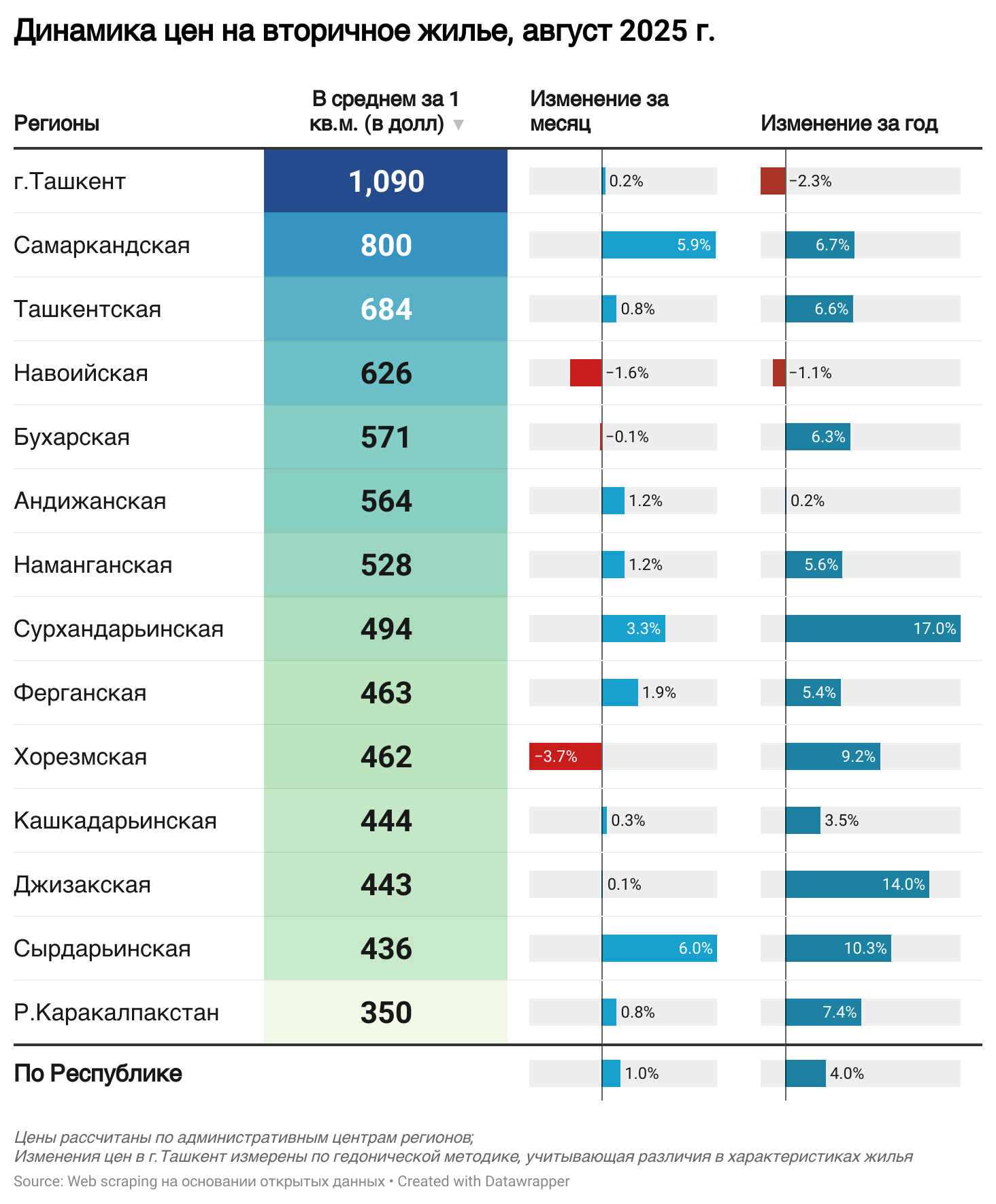 На уровне регионов наибольший рост стоимости жилья с августа прошлого года наблюдался в Джизакской (14%), Сурхандарьинской (17%) и Сырдарьинской (10%) областях.