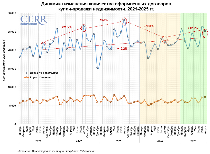 По итогам августа 2025 г., продажи составили 25 тыс. единиц жилья со снижением на 4,6% относительно прошлого месяца. При этом в годовом выражении рынок демонстрирует рост. Количество сделок по сравнению с августом прошлого года увеличилось на 13%.