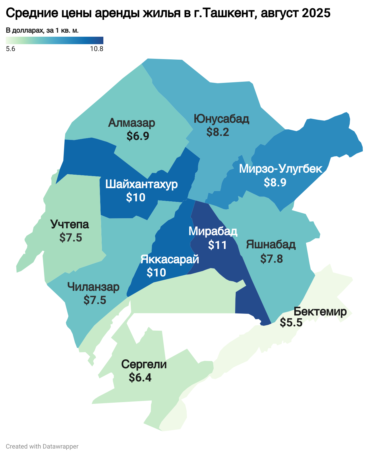 Наиболее высокие арендные ставки сохраняются в центральных районах столицы, таких как Мирабад, Шайхантахур и Яккасарай, где средний уровень составляет около 10,3 доллара за квадратный метр.