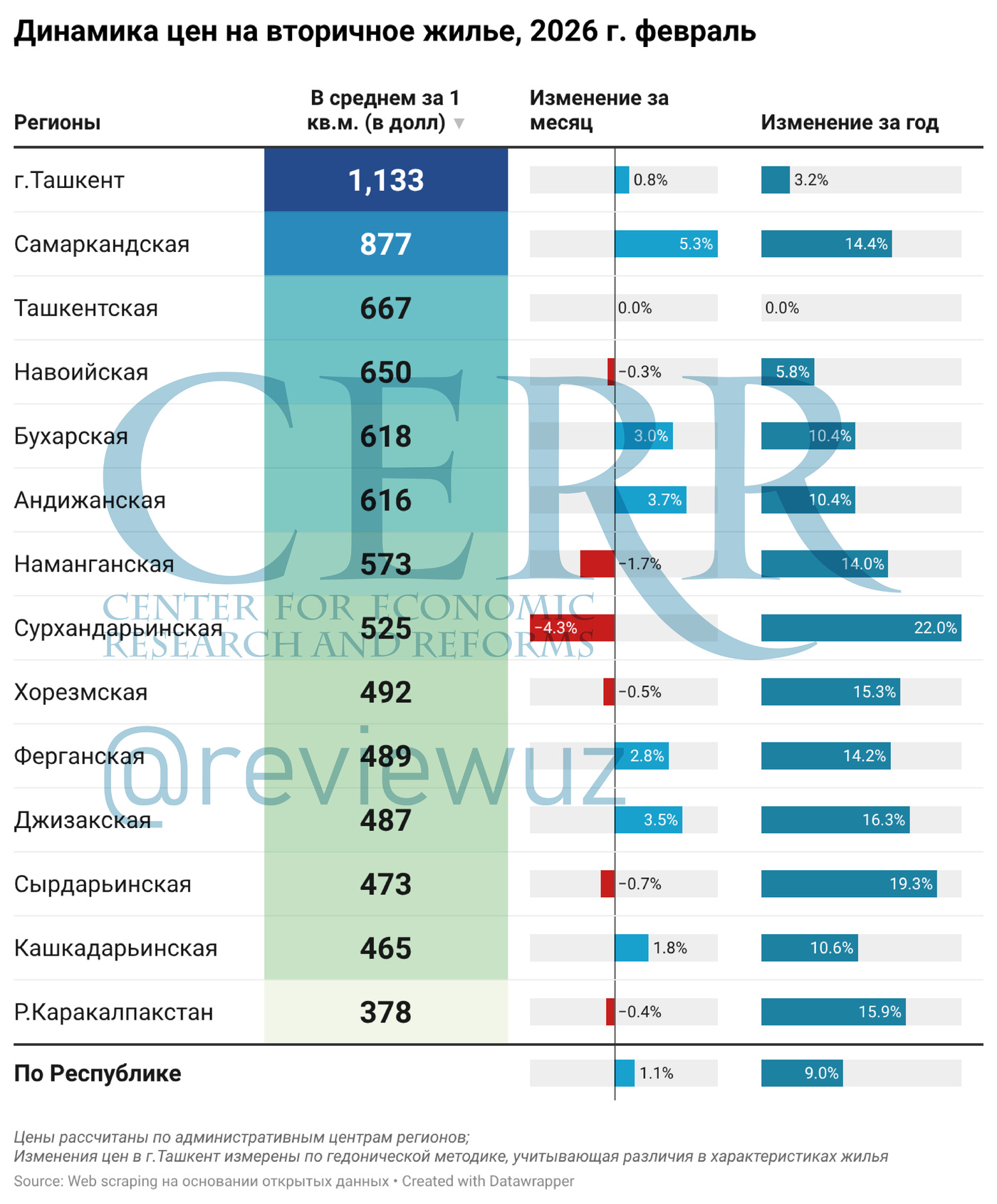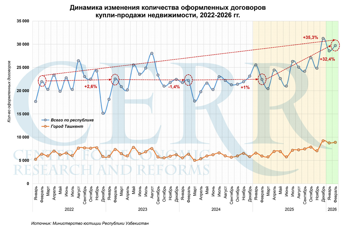 Центр экономических исследований и реформ представил обновлённый обзор динамики рынка недвижимости Узбекистана по итогам февраля 2026 года. Результаты отражают изменения в активности сделок и региональной структуре, а также тенденции на рынке жилья и аренды в столице.