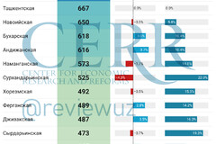 Относительно прошлого месяца в разрезе регионов наибольший рост отмечен в Ташкентской области, где показатель увеличился на 25%. В Навоийской области рост составил 22,6%, а в Сырдарьинской области 13,4%.