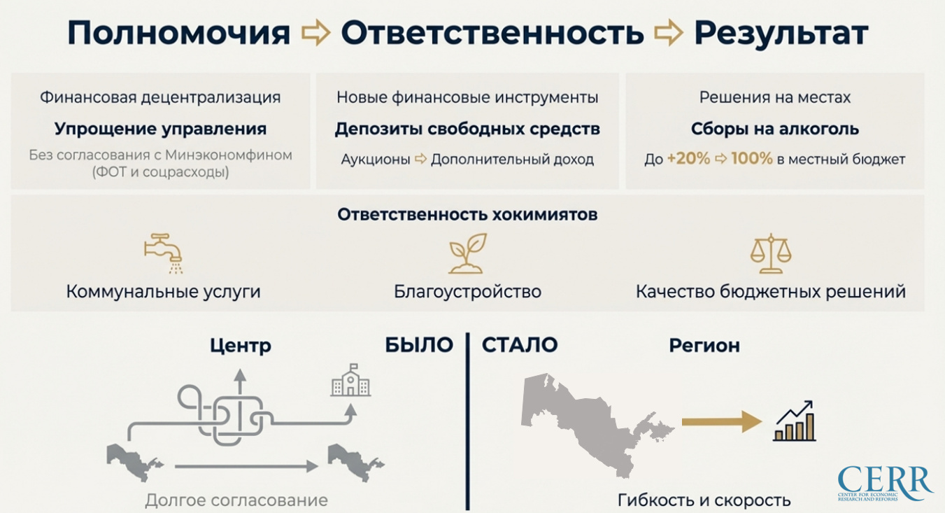 Реформа формирует более устойчивую и предсказуемую бюджетную базу для решения социально-экономических задач на местах и одновременно усиливает управленческую автономию. Местные органы власти получают больше полномочий в перераспределении средств, включая отмену необходимости согласования с центром изменений в пределах лимитов по зарплате, медикаментам и продовольствию. Впервые разрешено размещать временно свободные бюджетные средства на депозитах банков через аукцион для получения дополнительного дохода.