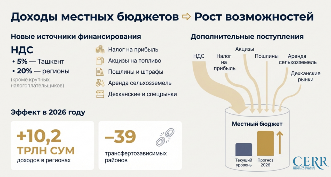 С 1 января 2026 года вводятся новые механизмы формирования доходной базы районных и городских бюджетов. Впервые часть поступлений по налогу на добавленную стоимость закрепляется за местными бюджетами: 5% по Ташкенту и 20% по остальным регионам, за исключением крупных налогоплательщиков. Одновременно расширяется участие территорий в доходах по налогу на прибыль, акцизам, государственным пошлинам, штрафам и сборам, с введением нормативов распределения в пользу районов и городов.
