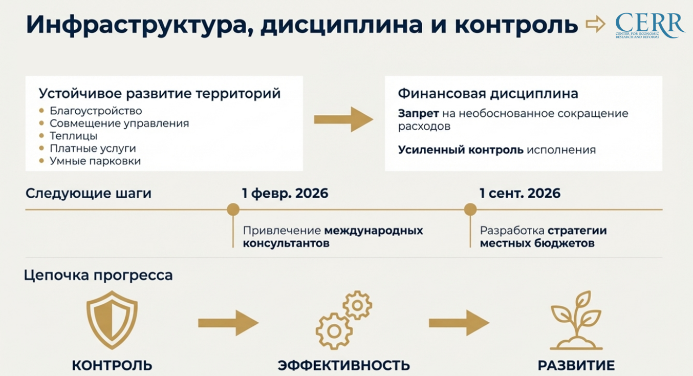 Реформа имеет долгосрочный стратегический характер. До 1 февраля 2026 года при участии международных консультантов будет проведён углублённый анализ процессов фискальной децентрализации, а до 1 сентября 2026 года будет разработана Стратегия реформирования местных бюджетов. Параллельно реализуются многолетние программы модернизации инфраструктуры, благоустройства и дренажных систем.