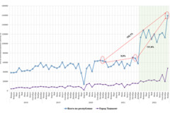 Количество предложений на вторичном рынке автотранспортных средств также существенно возросло. В последний месяц осени по республике продано более 126 тыс. автомобилей, что на 38% больше, чем в октябре. За год вторичный авторынок вырос в 2,5 раза.