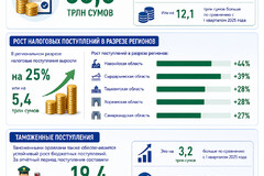 В региональном разрезе налоговые поступления выросли на 25%, или на 5,4 трлн сумов. В частности, рост составил: в Навоийской области — 44%, в Сырдарьинской области — 39%, в Ташкентской и Хорезмской областях — по 28%, в Самаркандской области — 27%.