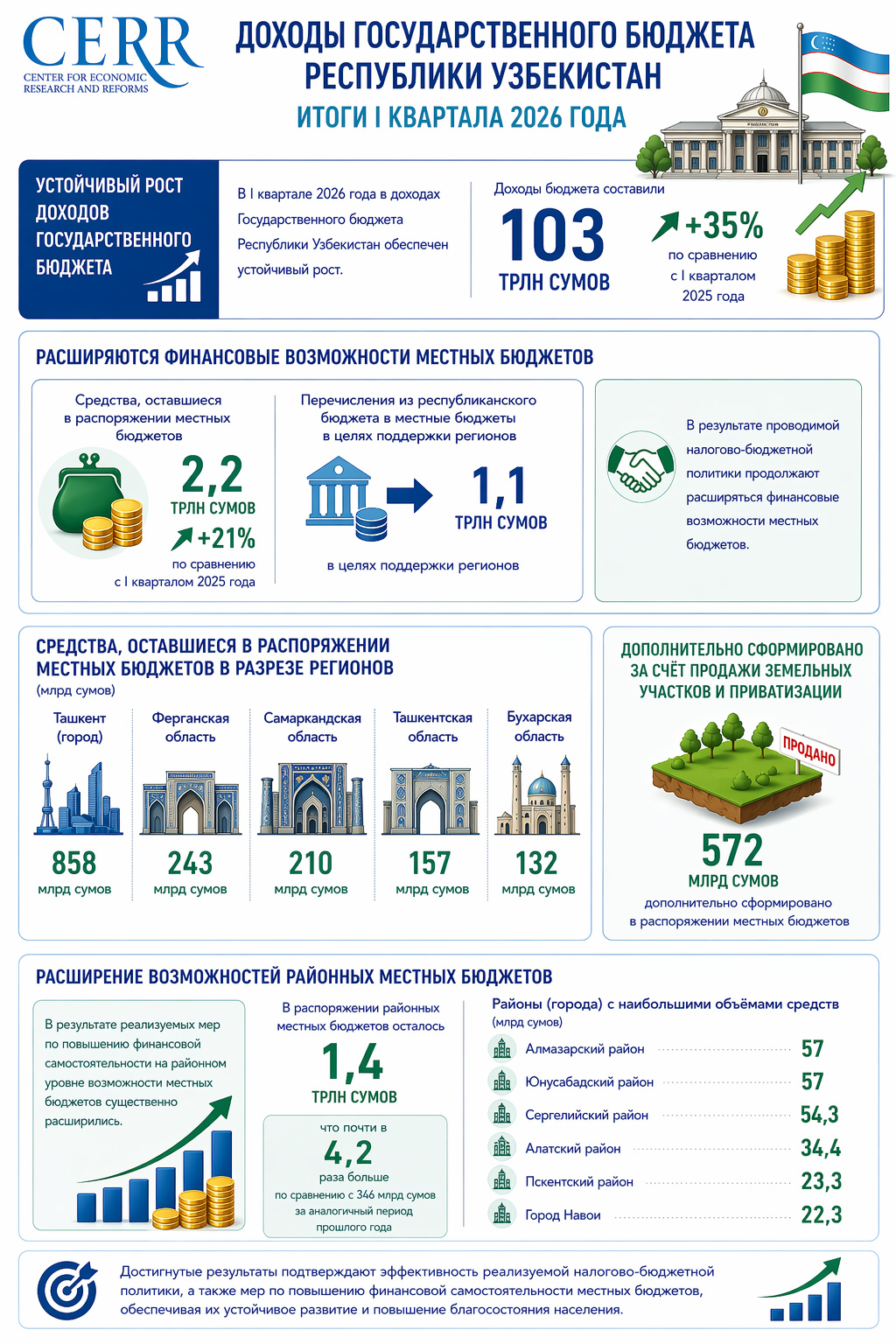 В результате реализуемых мер по повышению финансовой самостоятельности на районном уровне возможности местных бюджетов существенно расширились. В частности, в распоряжении районных местных бюджетов осталось 1,4 трлн сумов, что почти в 4,2 раза больше по сравнению с 346 млрд сумов за аналогичный период прошлого года. В частности, в Алмазарском и Юнусабадском районах — по 57 млрд сумов, в Сергелийском районе — 54,3 млрд сумов, в Алатском районе — 34,4 млрд сумов, в Пскентском районе — 23,3 млрд сумов, в городе Навои — 22,3 млрд сумов.