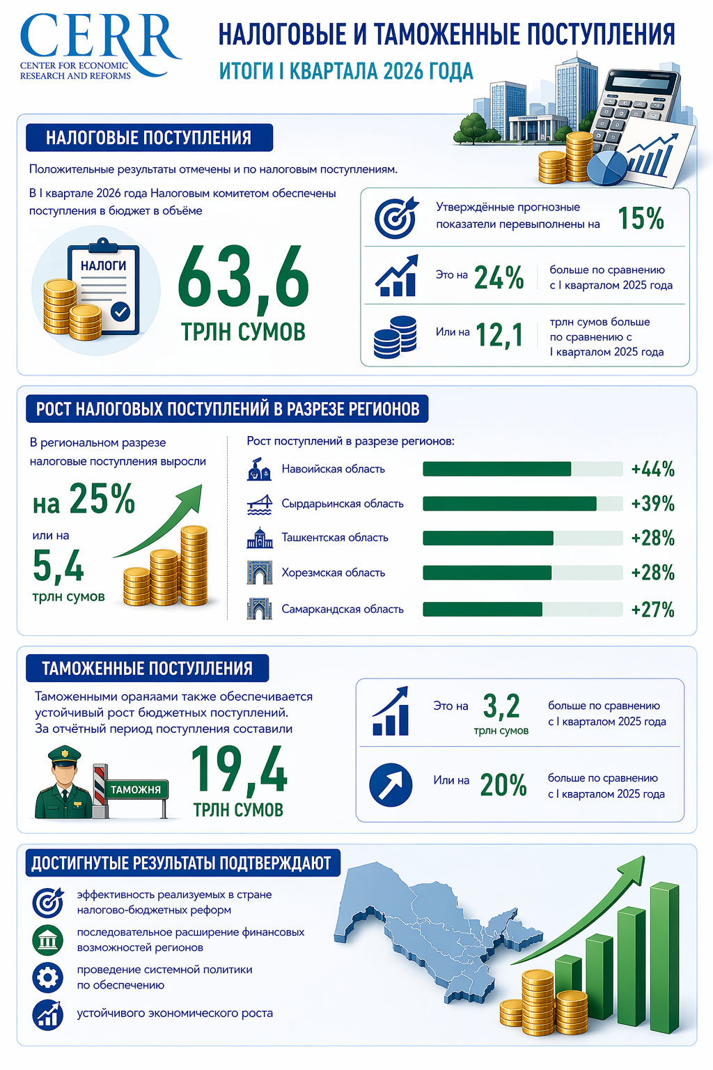 Достигнутые результаты подтверждают эффективность реализуемых в стране налогово-бюджетных реформ, последовательное расширение финансовых возможностей регионов и проведение системной политики по обеспечению устойчивого экономического роста.