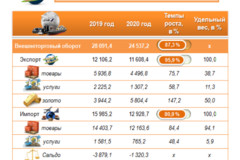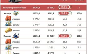 Из общего объема ВТО экспорт составил 11,6 млрд долларов (к январю-августу 2019 года отмечено снижение на 4,1%), импорт 12,9 млрд долларов (снижение на 19,1%). В результате сальдо внешнеторгового оборота составило пассивный баланс на сумму 1,3 млрд долларов.