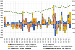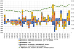 В связи с ростом цен на золото на мировом рынке (переоценки остатка монетарного золота) объем ЗВР увеличился на $1,4 млрд, в то время как продажа золота (в размере 370 тысяч тройских унций) привела к снижению ЗВР на сумму $700 млн.