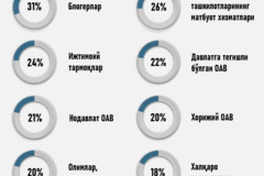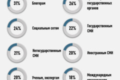 Журнал "Экономическое обозрение" провел опрос среди читателей, в котором изучена степень доверия населения источникам информации. Анализ показал, что больше всего граждане доверяют – блогерам (31%), на втором месте – государственные органы пресс-служб (26%), на третьем – социальные сети.
