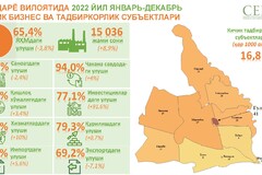 2022 йил январь-декабрь ойлари давомида ялпи ҳудудий маҳсулотнинг 65,4% (2021 йил январь-декабрида 69,2%) кичик бизнес субъектлари томонидан ишлаб чиқарилди.