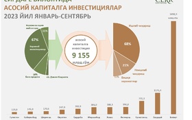 - 2 973,4 mlrd. so‘mlik qurilish ishlari (qurilish ishlari umumiy hajmining 76,2%i) bajarildi va o‘sish sur’ati 2022 yilning shu davriga nisbatan 104,4%ni tashkil etdi;