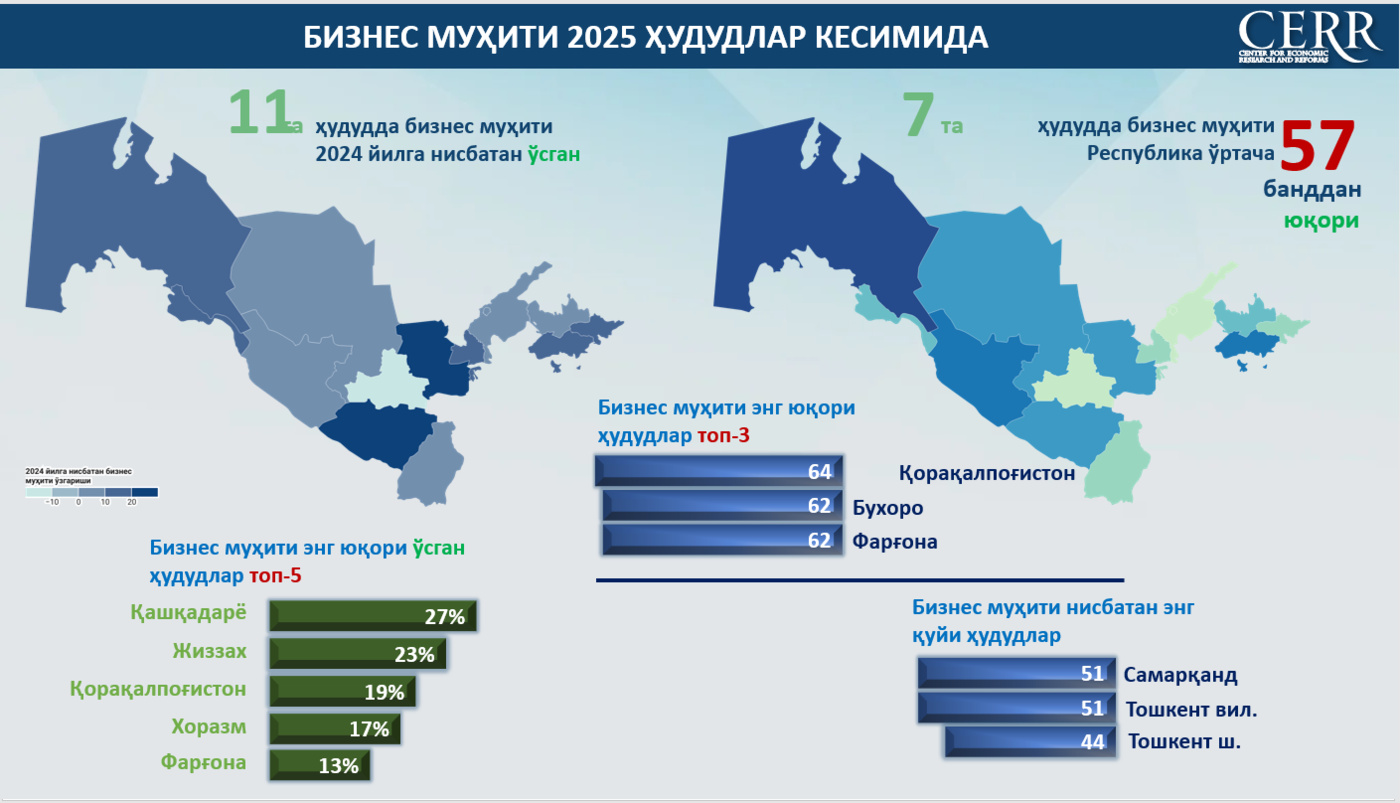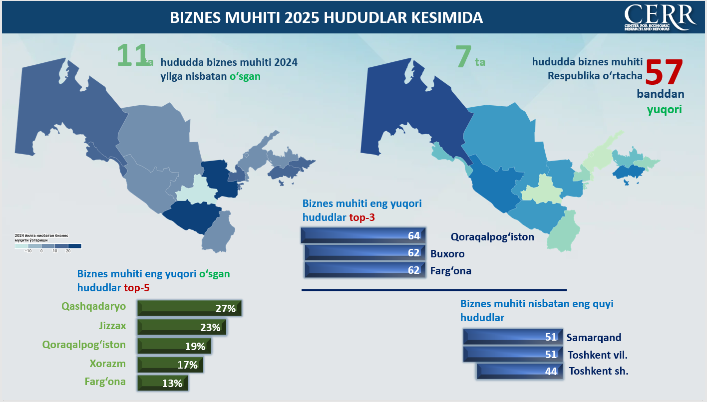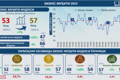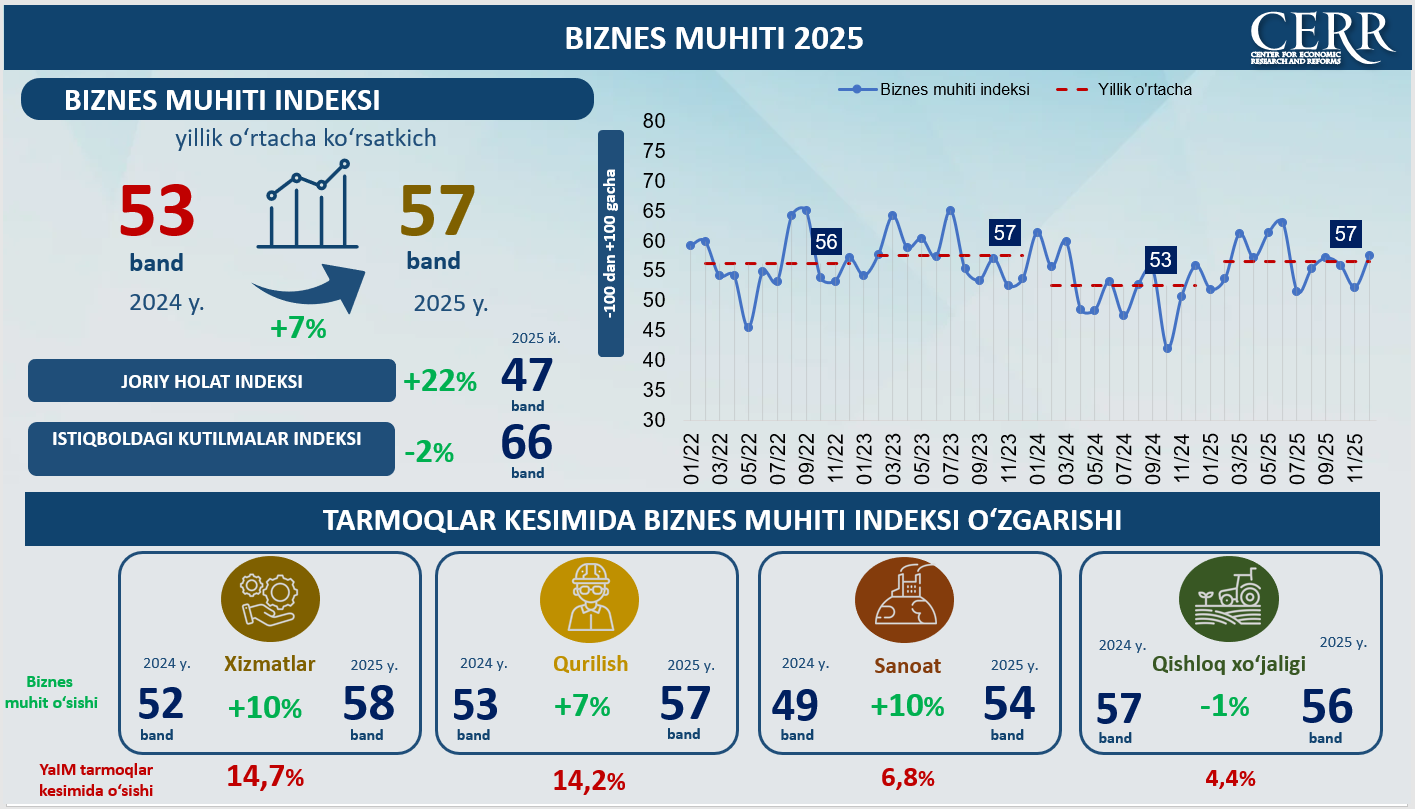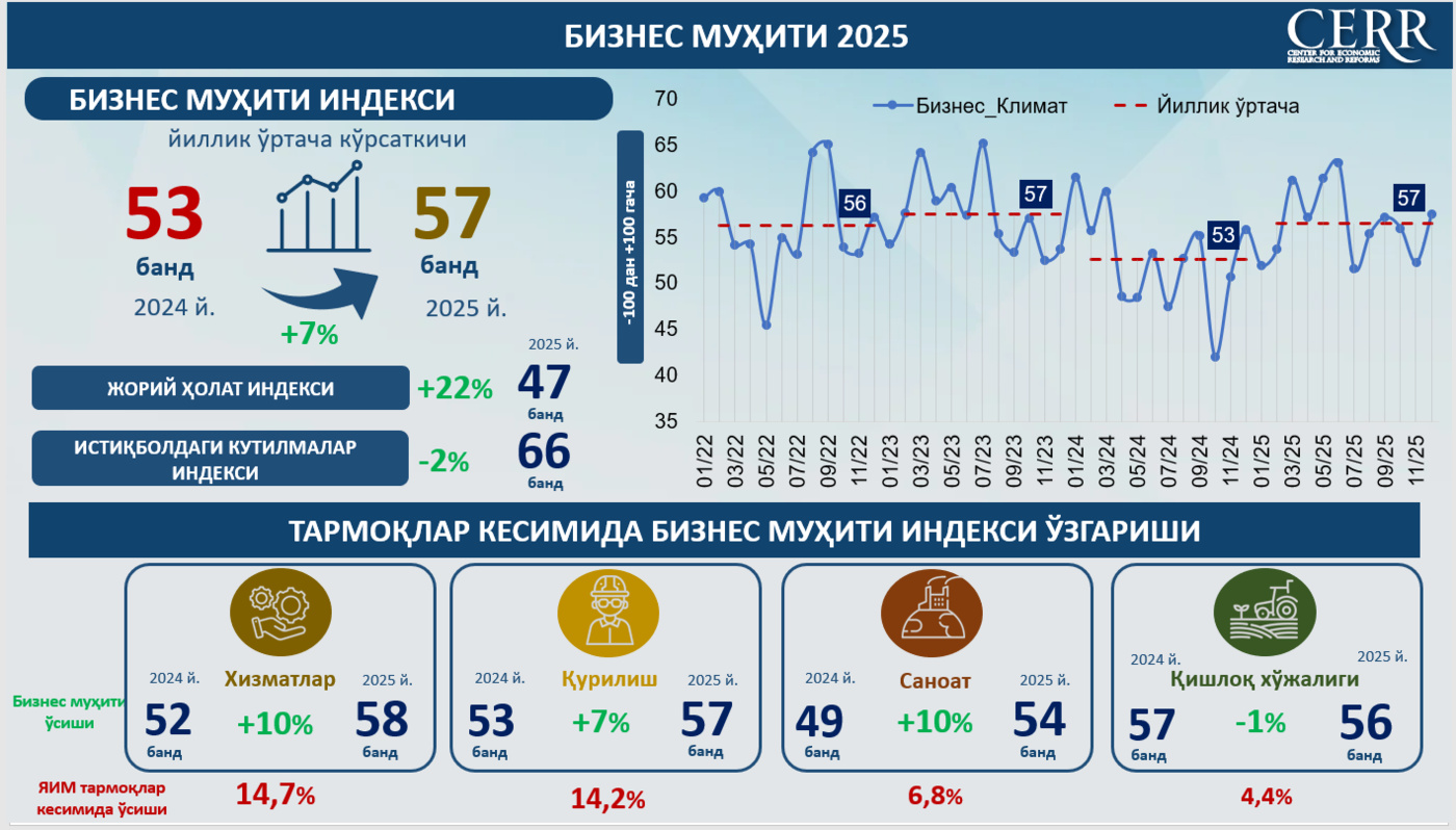 2025 yil yakunlariga ko‘ra, O‘zbekistonda umumlashtirilgan biznes muhiti indeksi o‘rtacha 57 bandni tashkil etdi (−100 dan +100 gacha bo‘lgan shkalada), bu 2024 yil ko‘rsatkichidan 7%ga yuqori. O‘sish asosan joriy holat bo‘yicha baholarning yaxshilanishi hisobiga ta’minlandi. Jumladan, biznesning joriy holat indeksi o‘rtacha yillik qiymati 22%ga o‘sib, 47 bandga yetdi.