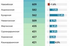 Shuningdek, ikkilamchi uy-joy bo‘yicha yuqori narxlar Samarqand va Toshkent viloyatlarida saqlanib qolgan bo‘lsa (o‘rtacha narx mos ravishda 750 va 660 dollar), nisbatan arzon narxlar Qoraqalpog‘iston Respublikasida qayd etilgan (327 dollar).