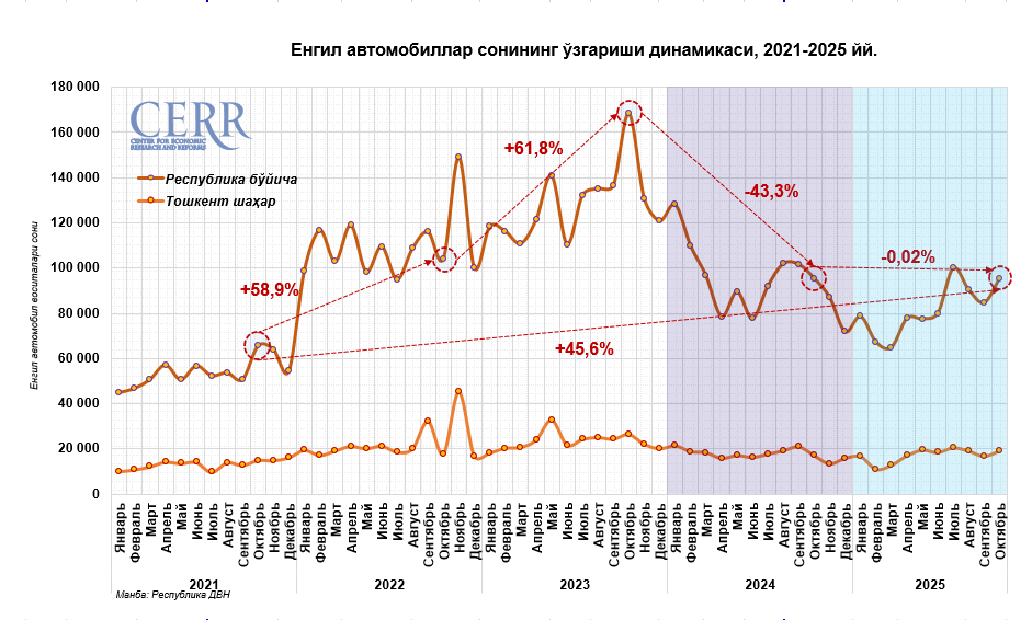 Birlamchi va ikkilamchi bozorlarda yengil avtomobillar segmenti oylik 12,7% o‘sishni ko‘rsatdi va 95,4 ming donani tashkil yetdi. Eng yuqori o‘sish Namangan, Jizzax va Buxoro viloyatlarida qayd etilgan bo‘lib, bu hududlarda savdolar 20%dan ziyod oshdi. Shu bilan birga, Samarqand viloyati va Qoraqalpog‘iston Respublikasida faollik biroz pasaygani kuzatildi.