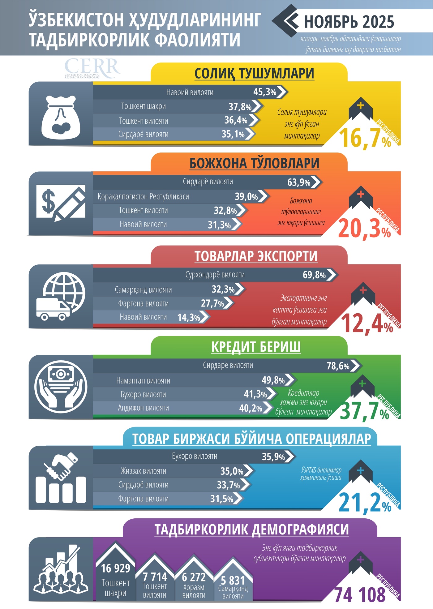 Markaziy Bank, Coliq va Bojxona qo‘mitalari hamda Respublika tovar-xomashyo birjasi tomonidan taqdim etilgan tezkor ma’lumotlarga asoslanib, Iqtisodiy tadqiqotlar va islohotlar markazi tahlilchilari har oyda O‘zbekiston Respublikasining barcha hududlarida tadbirkorlik faoliyatini har tomonlama tahlil qilib boradi.