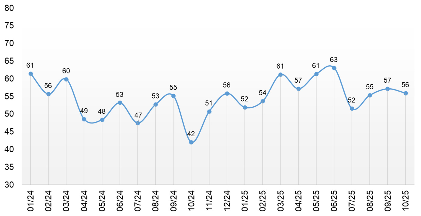Biznes muhiti bo‘yicha jamlanma indikator oktyabr oyida o‘sishni davom ettirib, 55 bandga yetdi, bu o‘tgan yilning shu davridagi ko‘rsatkichidan 13 bandga yuqori. O‘sish barcha komponentlar hisobiga amalga oshdi.