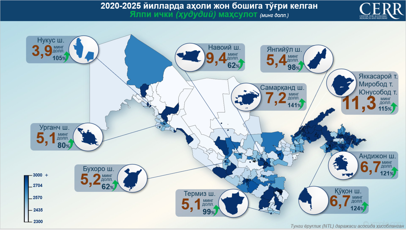 Ma’lumotlarga ko‘ra, so‘nggi besh yilda hududlar kesimida aholi jon boshiga YaHM miqdori bo‘yicha eng katta o‘sish Toshkent shahrida qayd etildi. Bu ko‘rsatkich taxminan 5 ming dollarga oshib, 2025 yil yakunlariga ko‘ra 9,3 ming dollarni (rasmiy statistikaga ko‘ra 9,2 ming dollar) tashkil etdi.