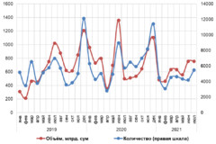 3-rasm. 2021 yilning yanvar-iyul oylari uchun viloyat bo‘yicha aholiga berilgan ipoteka kreditlari hajmi va soni