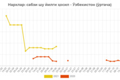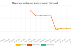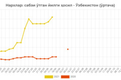 Yuqoridagi grafikdan ko‘rinib turibdiki, 2021 yilning 11 iyunidan boshlab, o‘tgan yilgi hosilning ulgurji narxlari 2020 yilning shu sanasiga nisbatan 5 baravar yuqori.