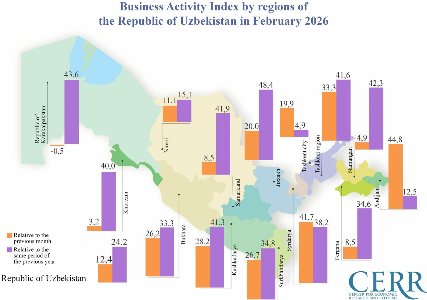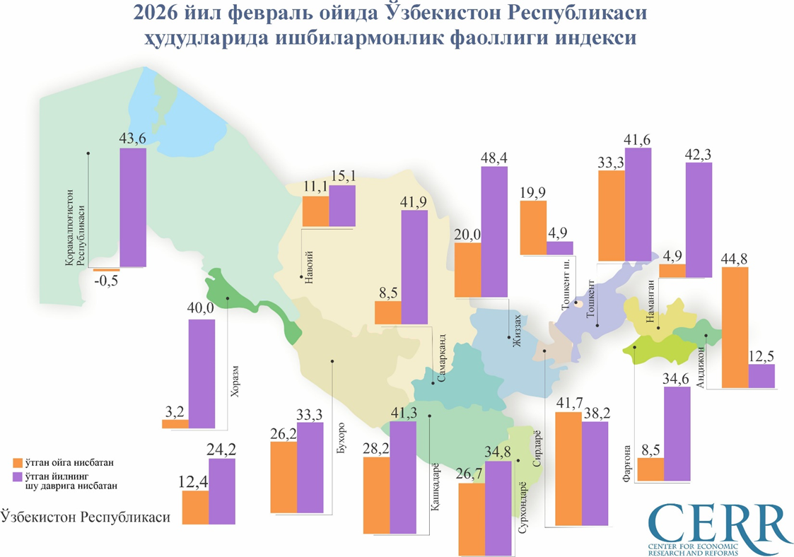 Iqtisodiy tadqiqotlar va islohotlar markazi tomonidan baholangan Ishbilarmonlik faolligi indeksi (IFI) 2026 yil fevral oyida 1124 birlikni tashkil etib, o‘tgan oyga nisbatan 12,4 foizga ortgan (o‘tgan yilning mos davriga nisbatan esa 24,2 foizga o‘sish kuzatilgan, Grafik №1).