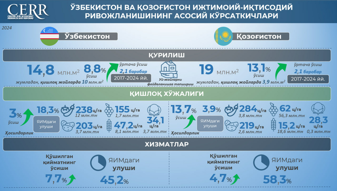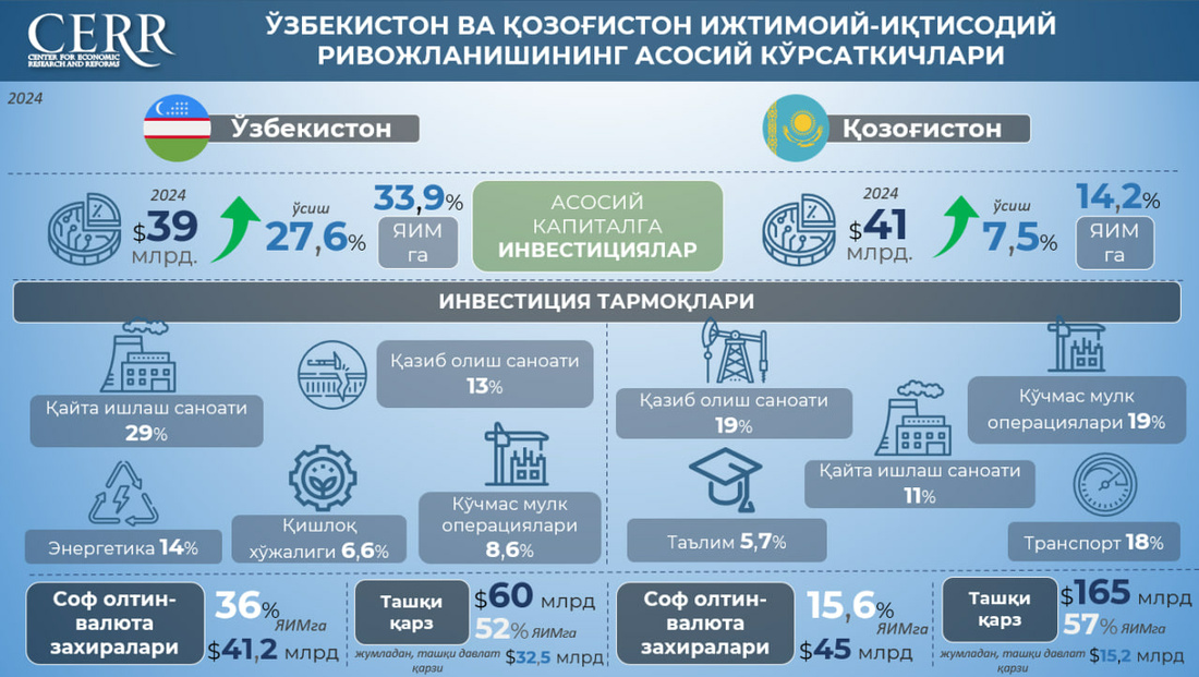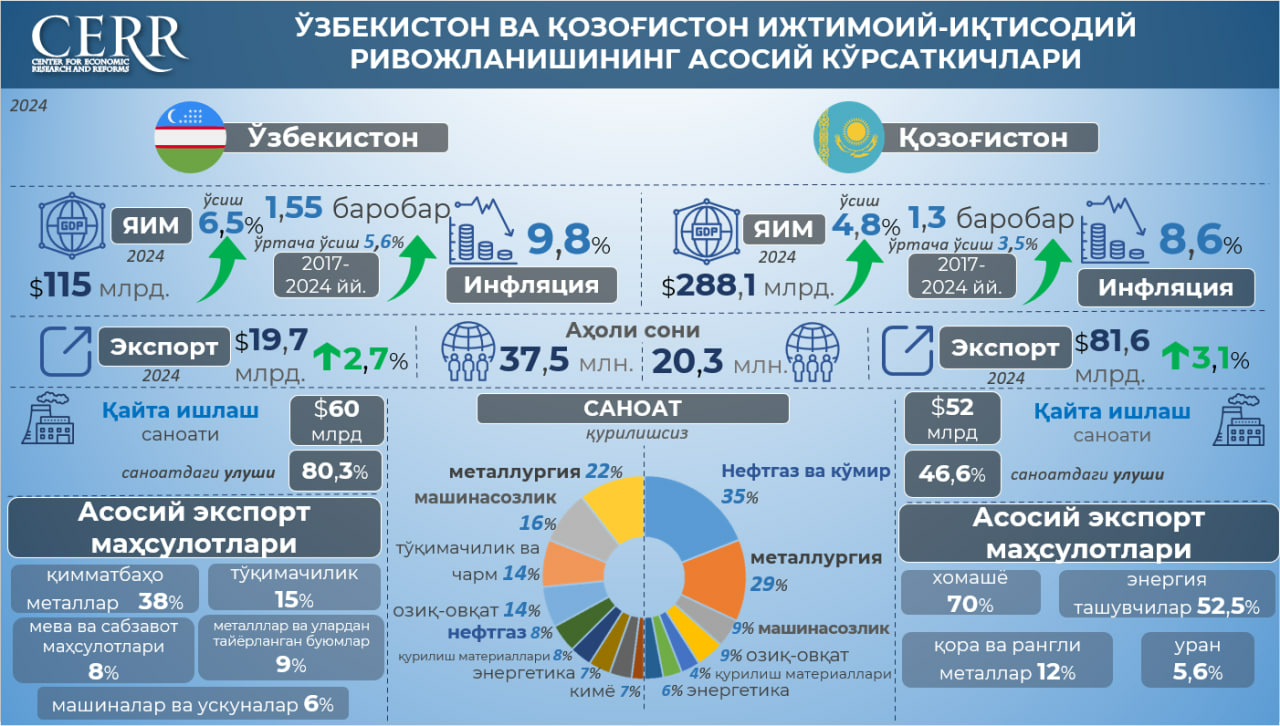 Iqtisodiy tadqiqotlar va islohotlar markazi (Markaz) 2024 yilda O‘zbekiston va Qozog‘istonning asosiy ijtimoiy-iqtisodiy ko‘rsatkichlariga oid infografika tayyorladi.