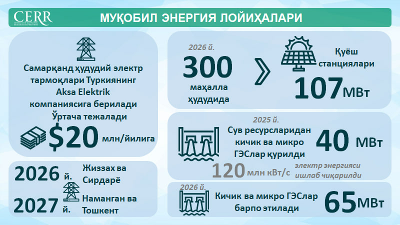 Shu bilan birga, kichik gidroenergetika ham rivojlanib bormoqda. Joriy yilda 40 megavatt quvvatga ega kichik va mikro GESlar barpo etildi, ular tomonidan 120 million kilovatt-soat elektr energiyasi ishlab chiqarildi va tadbirkorlar uchun yangi daromad manbai shakllandi. Kelgusi yilda yana 65 megavatt quvvatga ega kichik GESlar foydalanishga topshiriladi, bu esa 80 ming oilaning elektr ta’minotini sezilarli darajada yaxshilaydi.