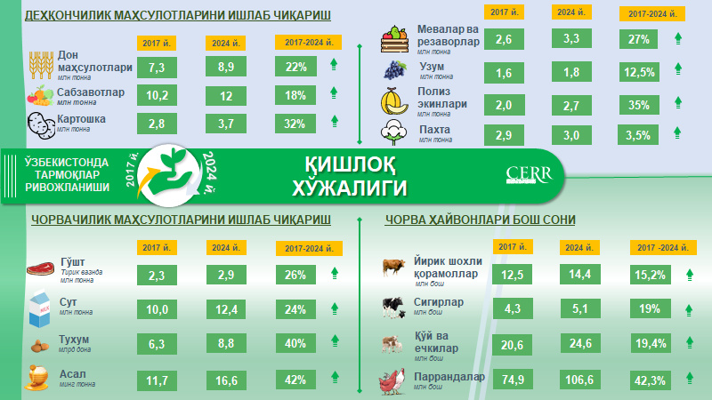 2017-2024 yillarda O‘zbekiston iqtisodiyotida qishloq xo‘jaligi tarmog‘ining bosqichma-bosqich kamayish (32 foizdan 19 foizgacha) tendensiyasi kuzatilgan bo‘lsada, mahsulot ishlab chiqarishning barqaror o‘sish sur’atlariga erishildi. So‘nggi 8 yil davomida qishloq xo‘jaligi mahsulotlarini ishlab chiqarish hajmi 17 foizga (o‘rtacha yillik o‘sish – 2,7 foiz) o‘sdi va 467 trln so‘mga yetdi. 2024 yilda qishloq xo‘jaligi mahsulotlari eksporti hajmi 1,6 mlrd AQSh dollarini tashkil etdi.