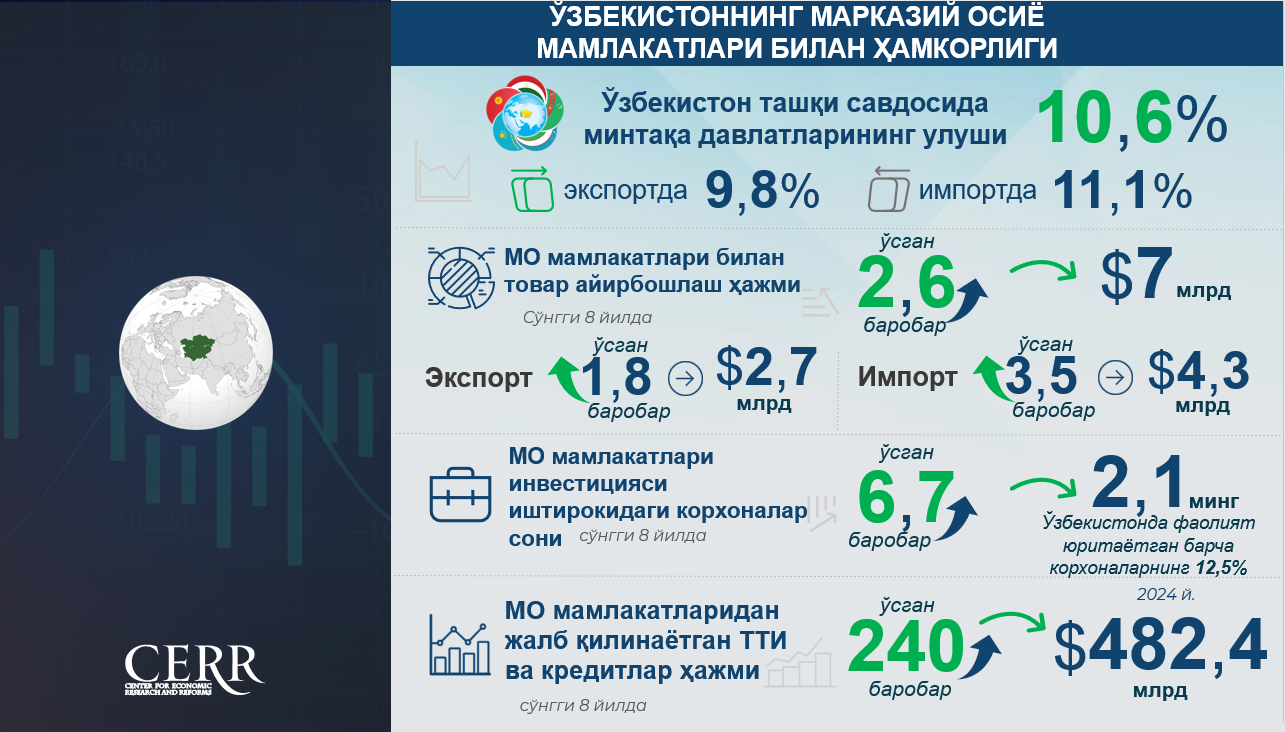 So‘nggi yillarda O‘zbekistonning Markaziy Osiyo mamlakatlari bilan iqtisodiy hamkorligi sezilarli darajada kengayib, mustahkamlandi. Bu esa nafaqat O‘zbekiston, balki butun mintaqadagi boshqa mamlakatlarning ham barqaror iqtisodiy o‘sishiga hissa qo‘shdi.