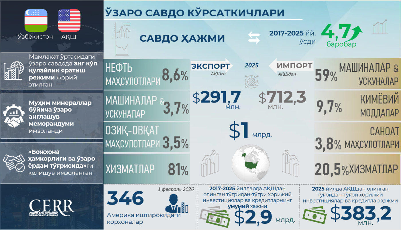 Infografika: O‘zbekiston va AQSh o‘rtasida savdo-iqtisodiy va investitsion hamkorlik
