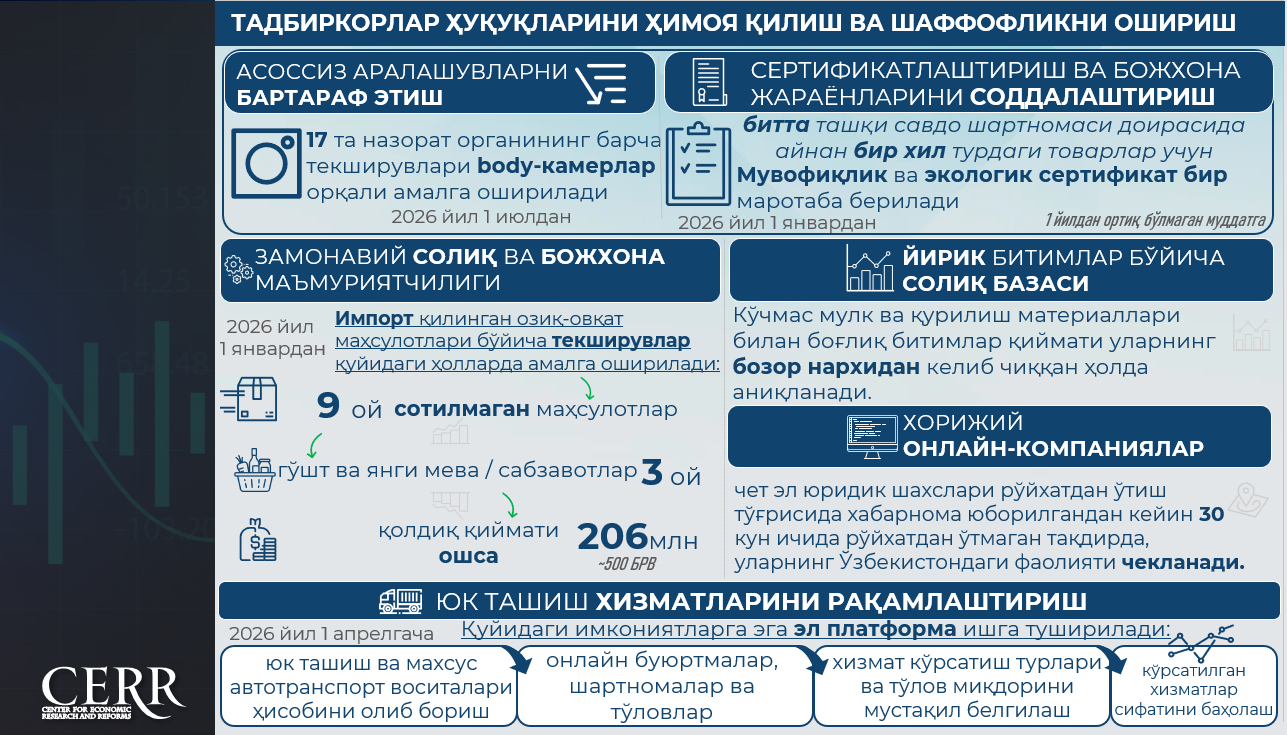 2026 yil 1 iyuldan boshlab 17 ta nazorat organi tomonidan o‘tkaziladigan barcha tekshiruvlar faqat shaxsiy videoregistratorlar (body-kameralar)dan foydalanilgan holda amalga oshiriladi. Ushbu qaror biznes va davlat tuzilmalari o‘rtasida ishonch va ochiqlikni oshirib, tekshiruv jarayonlarining ob’yektivligi va tadbirkorlar huquqlarining himoyasini ta’minlaydi.