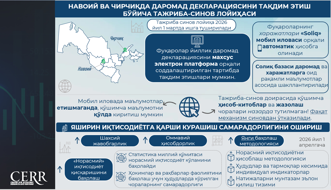 2026 yil 1 aprelga qadar yashirin iqtisodiyotni hisoblashning yangilangan metodologiyasi ishlab chiqiladi. U har bir mintaqa va sektor uchun alohida ko‘rsatkichlarni o‘z ichiga oladi.