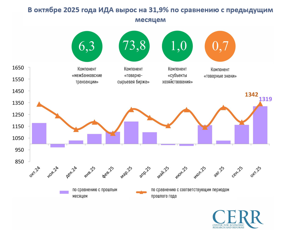 2025 yilning oktyabr oyida IFIning birja komponenti 1,7384 birlikni tashkil etdi. Bu esa, ushbu komponentning o‘tgan oyga nisbatan 73,8 foizga ortganini anglatib, har bir bitim bo‘yicha sotib olingan tovarlarning o‘rtacha hajmi 91,1 foizga va tuzilgan bitimlar soni 56,6 foizga ortganligi bilan izohlanadi.