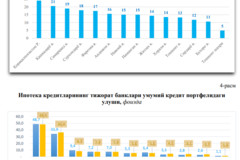 Лидерами по объему ипотечных кредитов стали г.Ташкент (1,64 трлн. сумов или 26,8% из общей суммы выданных кредитов), Самаркандская (585 млрд сумов) и Ферганская области (570 млрд сумов).