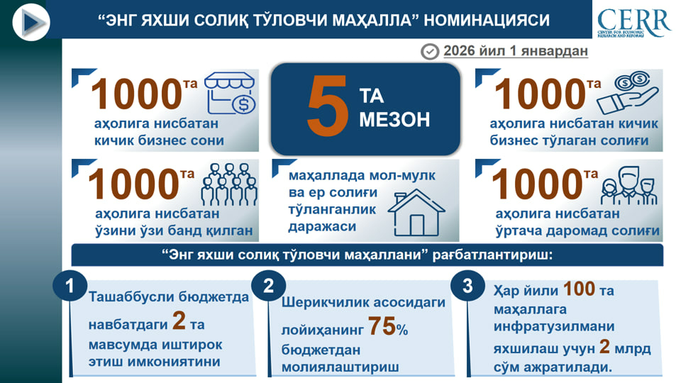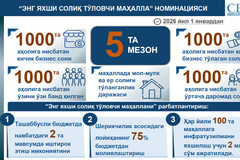 «Eng yaxshi soliq to‘lovchi mahalla» nominatsiyasi ta’sis etilib, u tashabbuskor jamoalarni qo‘llab-quvvatlash hamda mahalliy byudjetni mustahkamlashga qaratilgan bo‘ladi.