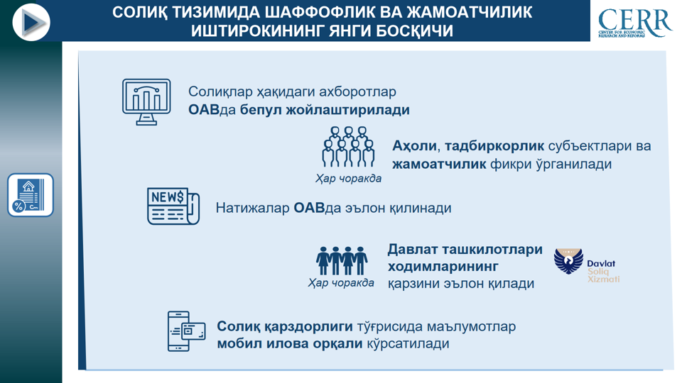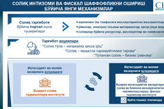 O‘zbekiston Respublikasi Prezidentining “Soliqlarning yig‘iluvchanlik darajasini oshirish va faol soliq to‘lovchilarni rag‘batlantirish chora-tadbirlari to‘g‘risida”gi qarori ijrosi doirasida mamlakatda soliq intizomini mustahkamlash, aholi va biznes o‘rtasida fiskal madaniyatni oshirish hamda yashirin iqtisodiyot ulushini qisqartirishga qaratilgan bir qator muhim yangiliklar amaliyotga joriy etilmoqda.