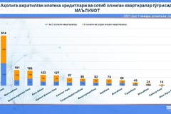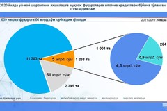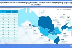 2021 yil 1 yanvar holatiga tijorat banklari taqdim etgan buyurtmalari asosida davlat byudjetidan 2 659 nafar fuqaroga ipoteka kreditlari bo‘yicha 65,8 mlrd.so‘m subsidiyalar to‘lab berildi. Jumladan, shaharlarda 2 395 nafar fuqaroga boshlang‘ich badal va foizlarni bir qismini qoplash uchun 64,9 mlrd. so‘m hamda qishloq joylarda 264 nafar fuqaroga foizlarni bir qismini qoplash uchun 0,9 mlrd. so‘m ajratildi.