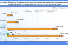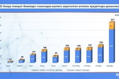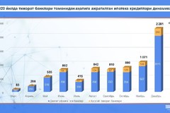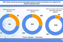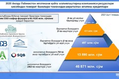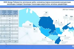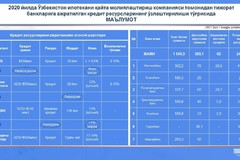 Shu bilan birga, “O‘zbekiston ipotekani qayta moliyalashtirish kompaniyasi” mablag‘lari hisobidan 2020 yil davomida tijorat banklari tomonidan 333 nafar fuqaroga 61,9 mlrd. so‘m kreditlar ajratilgan. Jumladan, birlamchi bozordagi uy-joylar uchun 928,7 mln. so‘m, ikkilamchi bozordagi uy-joylar uchun 60 761,1 mln. so‘m hamda uy-joylarni ta’mirlash uchun 230,0 mln. so‘m kreditlar ajratilgan.