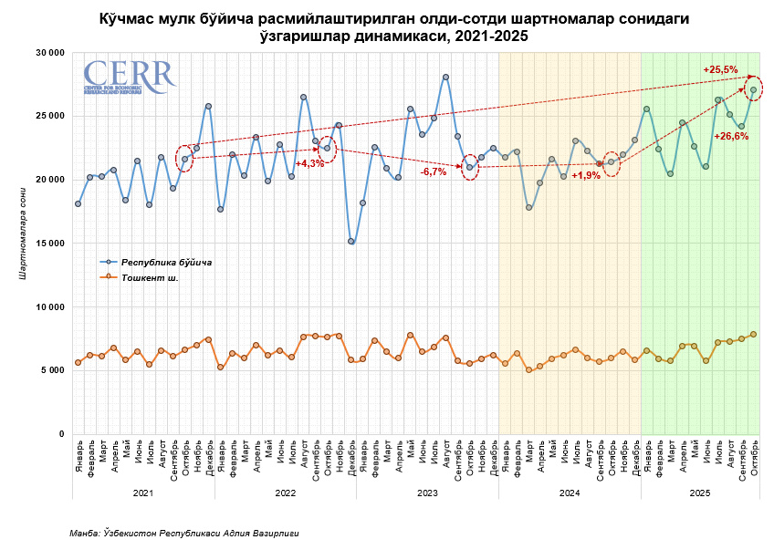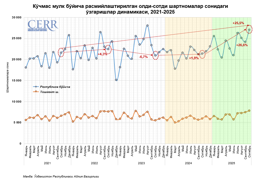 Respublika bo‘yicha uy-joy oldi-sotdi bitimlarining taxminan 30 %i Toshkent shahri hissasiga to‘g‘ri keladi. Oktyabr oyida poytaxtda savdo hajmi oylik hisobda 5,3 %ga, yillik hisobda esa 32 %ga oshdi.