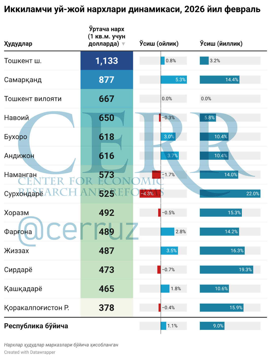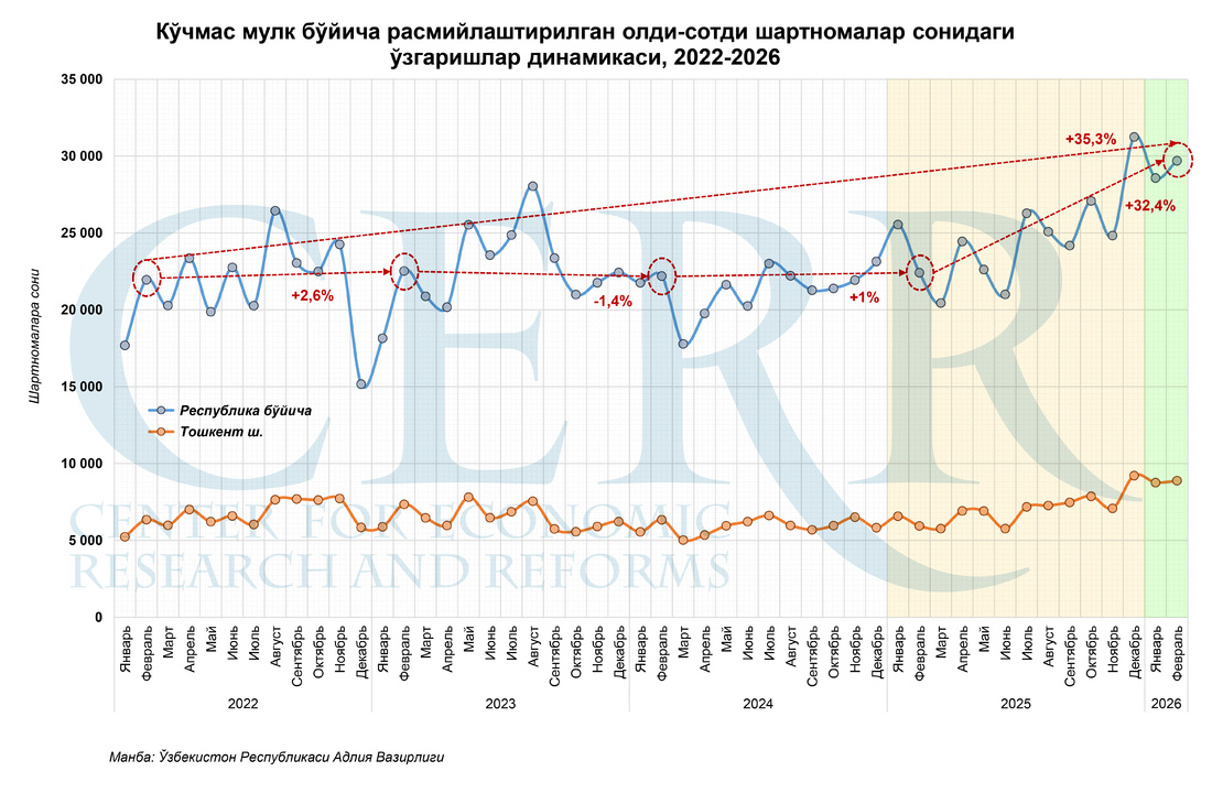 Iqtisodiy tadqiqotlar va islohotlar markazi 2026 yil fevral oyi yakunlari bo‘yicha O‘zbekistonda ko‘chmas mulk bozori dinamikasiga oid yangilangan tahlilni taqdim etdi. Unda bitimlar faolligi va hududlar kesimidagi o‘zgarishlar, shuningdek, poytaxtda uy-joy bozori va ijara narxlari tendensiyalari aks ettirilgan.