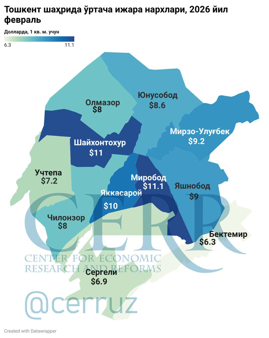 Fevral oyida poytaxtning markaziy tumanlarida ijara narxlari nisbatan yuqori bo‘lib qolmoqda. Jumladan, Mirobod, Shayxontohur, Yakkasaroy va Mirzo Ulug‘bek tumanlarida ijara narxi bir kvadrat metr uchun taxminan 11 dollar atrofida bo‘lgan.