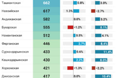 Yil boshidan ko‘chmas mulk oldi-sotdi dinamikasi ayrim hududlarida ijobiy tendensiyani ko‘rsatdi. Eng sezilarli o‘sish Jizzax viloyatida qayd etilib, sotuvlar 44%ga oshgan, shuningdek, Navoiy viloyatida 36%ga o‘sgan.