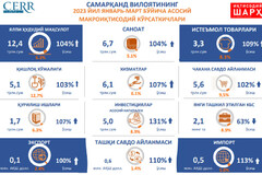 Ushbu davrda Samarqand viloyati YaHM hajmi 12,4 trln. so‘mni tashkil etgan xolda o‘tgan yilning mos davriga nisbatan 104% ga o‘sgan, shuningdek YaIM tarkibida viloyatning hissasi 6,3% ni tashkil etgan. Aholi jon boshiga to‘g‘ri keladigan YaHM hajmi esa 3 008,4 ming so‘mni tashkil qilgan o‘tgan mos davrga nisbatan 1,4% ga oshgan.