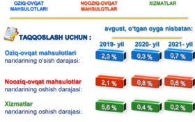 Joriy yilning sentyabr oyida oziq-ovqat mahsulotlari INI o‘sish darajasi oy davomida 1,2 % ni tashkil etdi. 2020 yilning sentyabrida ushbu ko‘rsatkich 1,0 foiz bandga va 2019 yilning sentyabr oyida esa 0,2 foiz bandga past bo‘lgan.