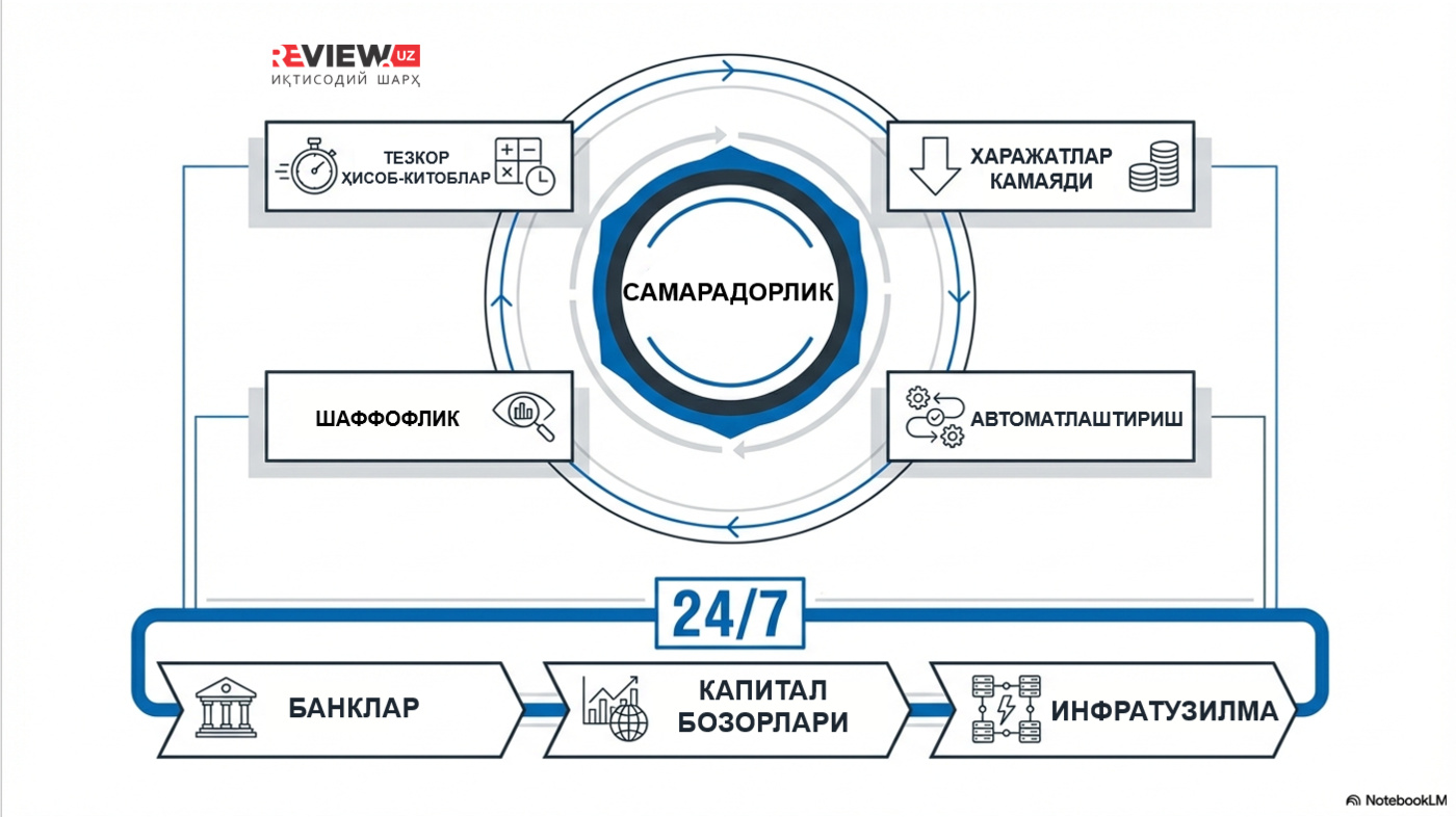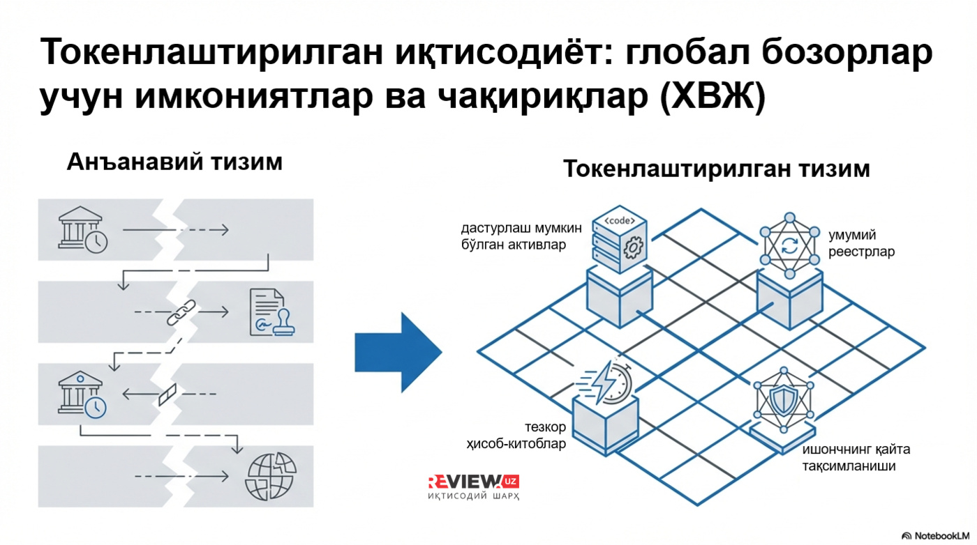 Hujjatda ta’kidlanishicha, tokenlashtirish faqat texnologik yangilanish emas, balki chuqur institutsional o‘zgarishdir. Ushbu jarayonda moliyaviy aktivlar va majburiyatlar taqsimlangan reyestrlar asosida ishlovchi dasturlashtiriladigan raqamli tokenlar shakliga o‘tkaziladi. Bu esa hisob-kitoblarni bir zumda amalga oshirish, likvidlikni uzluksiz boshqarish va smart-kontraktlar orqali moliyaviy operatsiyalarni avtomatlashtirish imkonini yaratadi.