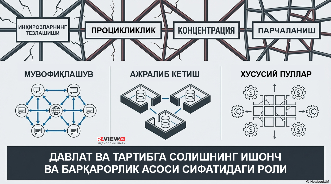 Rivojlanishning uchta ehtimoliy ssenariysi ko‘rib chiqilmoqda: davlat hisob-kitob aktivlariga tayanuvchi muvofiqlashtirilgan model, o‘zaro mos kelmaydigan platformalarga asoslangan parchalangan tizim va xususiy raqamli pullar ustunlik qiladigan ssenariy. Shu bilan birga, moliyaviy tizimning yakuniy shakillanishi, avvalo, davlat siyosati samaradorligi va xalqaro muvofiqlashuv darajasiga bog‘liq ekanligi ta’kidlanmoqda.